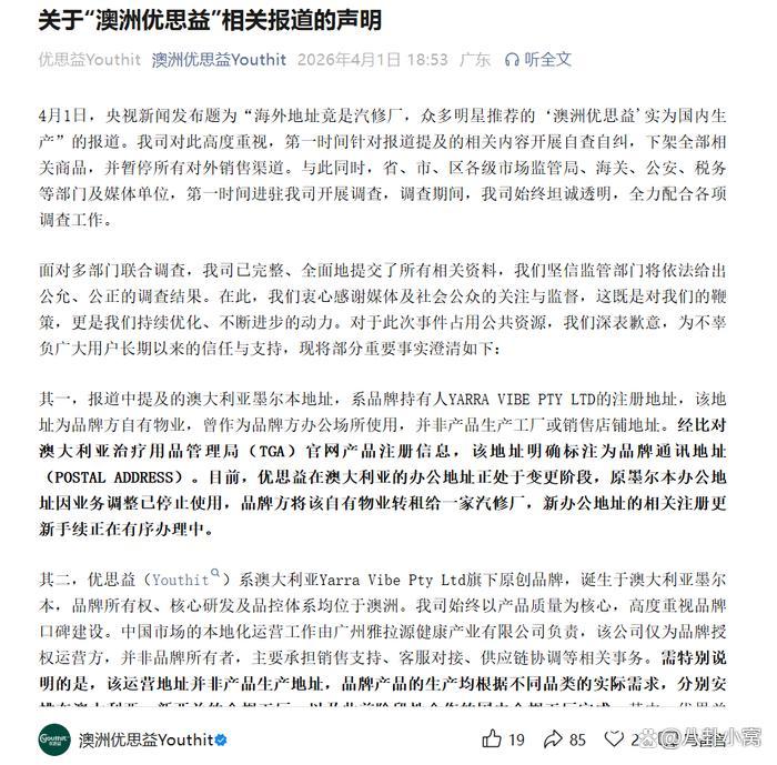 2026年4月1日,央视的一则报道如同投入直播电商行业的一颗深水炸弹,彻底揭穿了“澳洲优思益”这个假洋品牌的真面目。当消费者发现,这个号称澳大利亚原产、拥有国际大奖的保健品品牌,其注册地址竟是墨尔本的一家汽车维修站,所有品牌故事、专家背书都是精心编造的谎言时,一场信任危机迅速蔓延至曾为其带货的各大直播间。