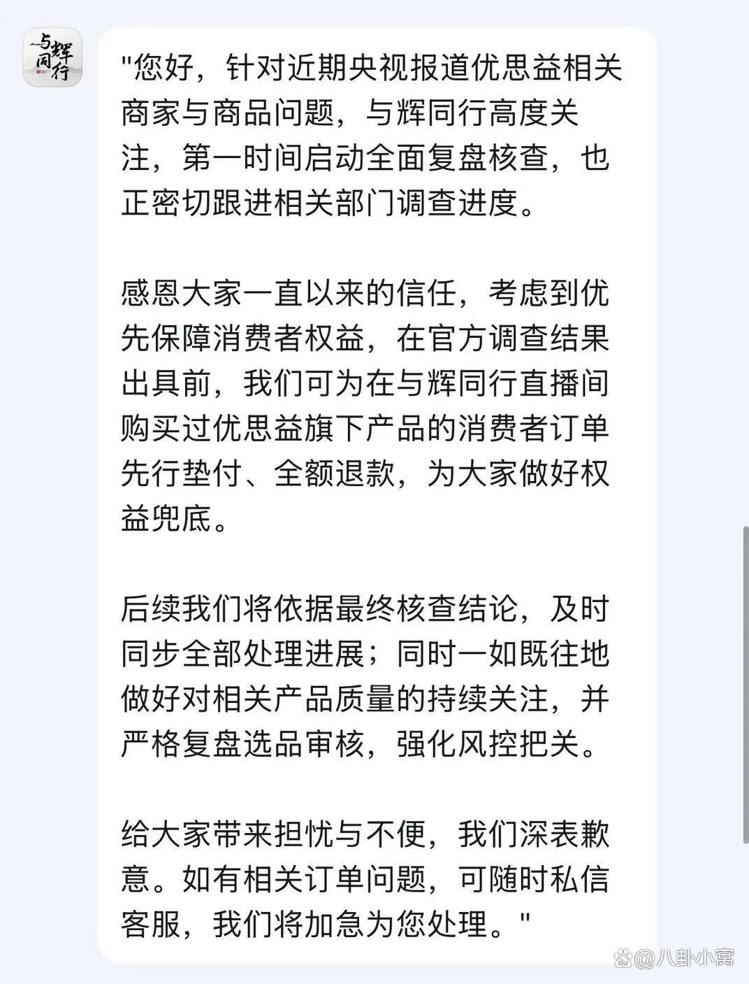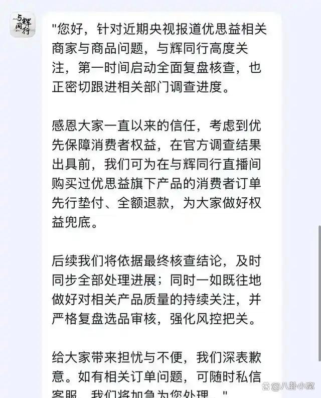 然而,优思益事件让这一切显得格外讽刺。一个连产地都是虚构的品牌,竟然通过了董宇辉口中如此严格的选品流程。更令人失望的是,当李若彤、章小蕙、明道等明星主播在24小时内火速公开致歉并承诺全额退款时,与辉同行却陷入了近一天的沉默。直到4月2日晚,才通过客服私信非正式地发布声明,表示会为消费者先行垫付、全额退款。